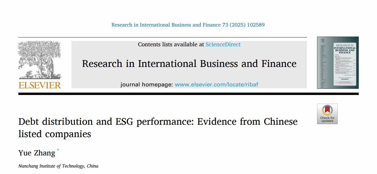 近期,水经济与管理研究中心成员张越博士最新研究成果“Debt distribution and ESG performance: Evidence from Chinese listed companies”被国际商业与金融领域的国际高水平期刊Research in International Business and Finance接受并正式发表。Research in International Business and Finance是ABS列表中的2星级期刊,ABDC期刊列表中的B级期刊,属于JCR Q1分区,中科院SSCI大类二区TOP期刊。张越博士为该成果的第一作者,我校为该成果的第一署名单位。